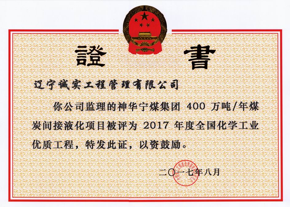 2017年全国化学工业优质工程(神华宁煤集团400万吨/年煤炭间接液化项目)