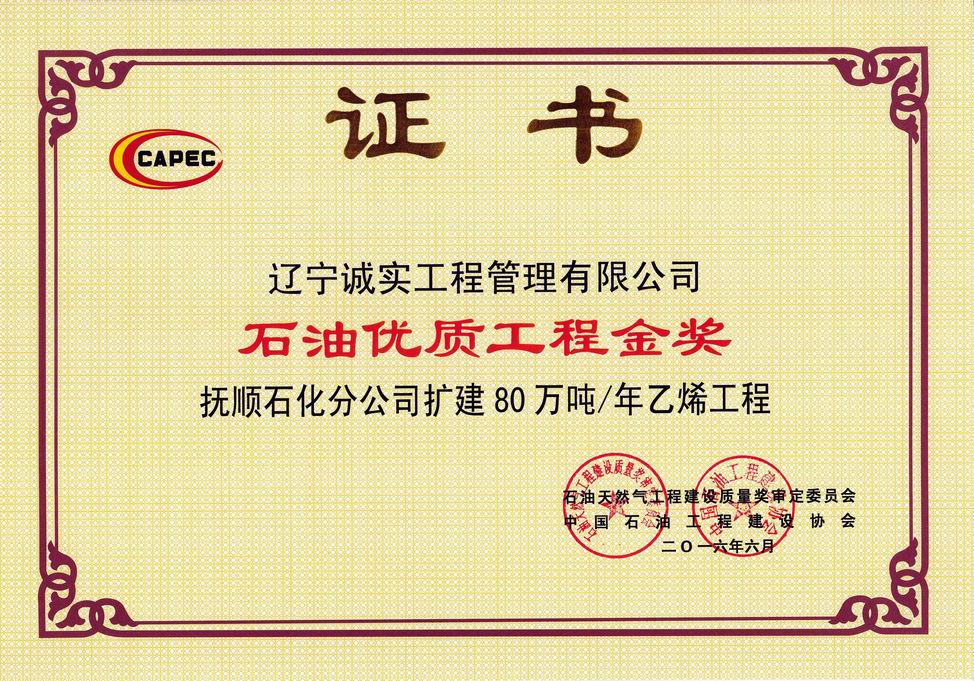 2016年石油优质工程金奖(抚顺石化分公司扩建80万吨/年乙烯工程)