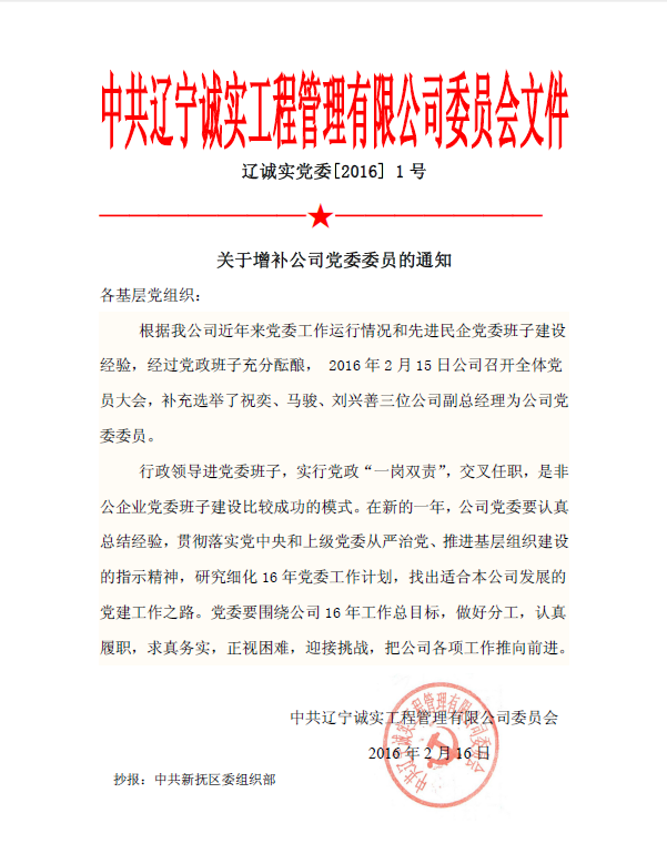 中共B体育手机官方网站入口委员会文件——关于增补公司党委委员的通知