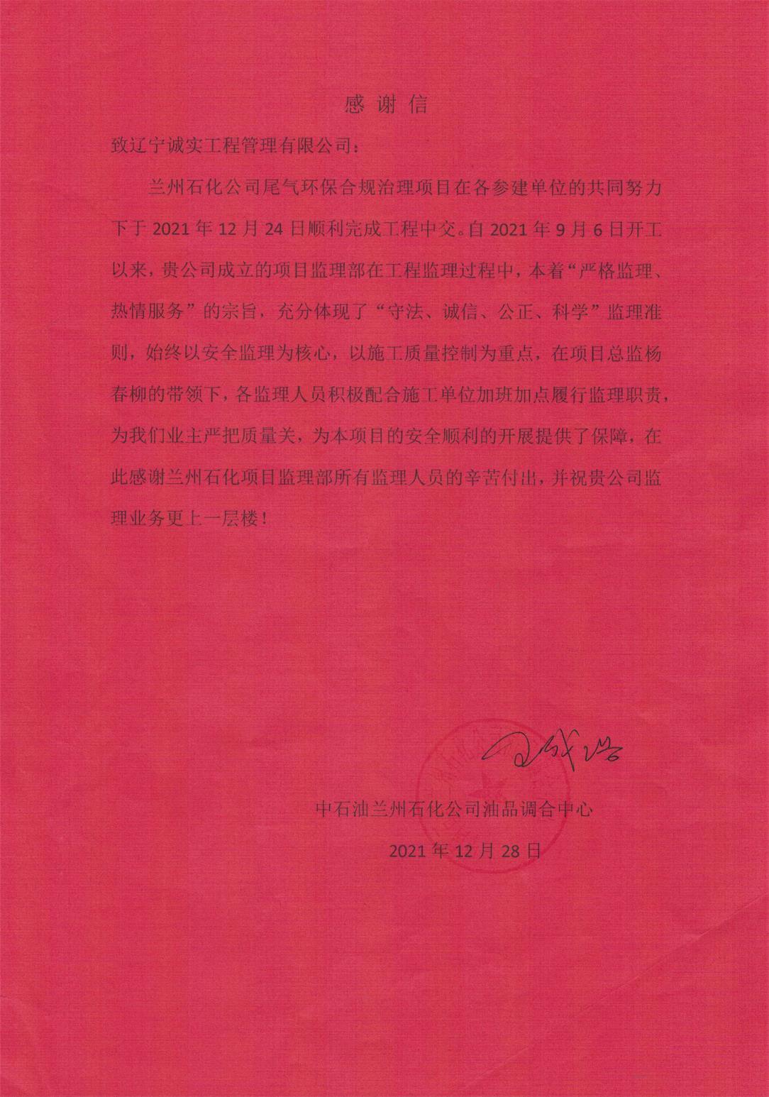 12月28日,兰州项目监理部收到中石油兰州石化公司油品调合中心发来的感谢信。信中,业主单位对项目部全体监理人员在项目开展过程中的工作表现给予了充分的肯定和高度的赞誉。这是对我公司卓越的项目管理水平和强大的人才队伍的最好见证,同时也完美的展现了我们一贯以来“敢打硬仗、善打难仗、能打胜仗”的优良传统和作风。希望各项目部要以此为动力,不忘初心,牢记使命,担当作为,为树立诚实品牌、打造诚实形象再立新功!