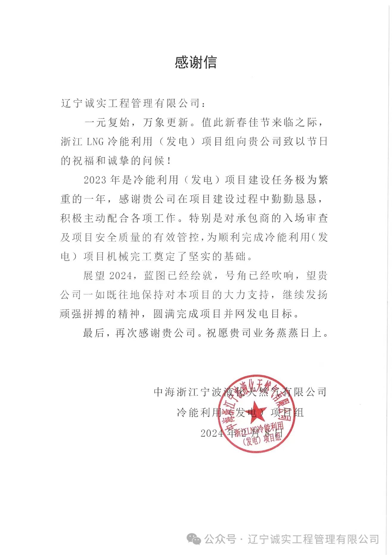 浙江LNG冷能利用(发电)项目组向公司发来了感谢信,信中肯定了公司项目部人员在2023年的努力,特别是对于承包商入场审查及项目安全质量的有效管控,为项目机械完工奠定了坚实的基础。该项目是积极响应国家及浙江省十四五规划的节能减排政策,落实“绿色低碳发展战略的示范项目,项目投产后,预计年净发电量约为2408万度,节省标准煤超3000tce,年减少CO排放可达18000多吨。展望2024年,项目部在黄思敏总监的带领下,将认真执行监理职责,积极推进项目建设,争取项目早日建成投产。