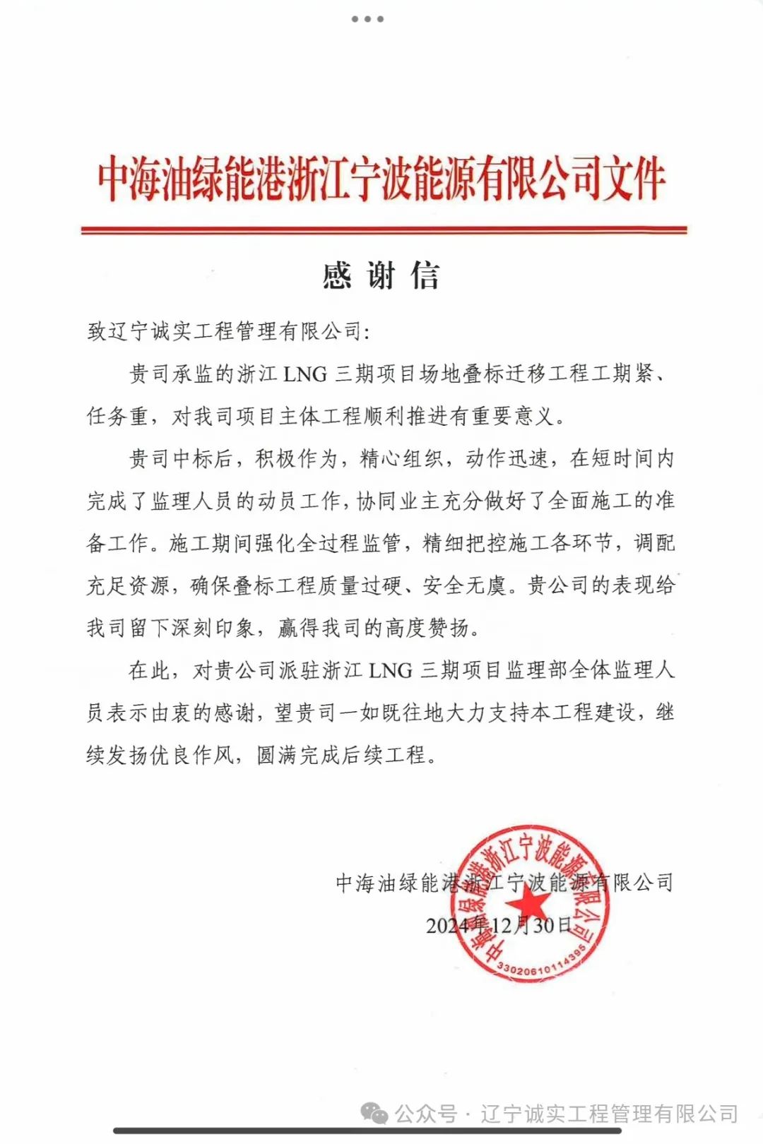 至此2025元旦来临之际,浙江LNG三期项目场地叠标迁移项目部收获来自于中海油绿能港浙江宁波能源有限公司发来的一封感谢信。