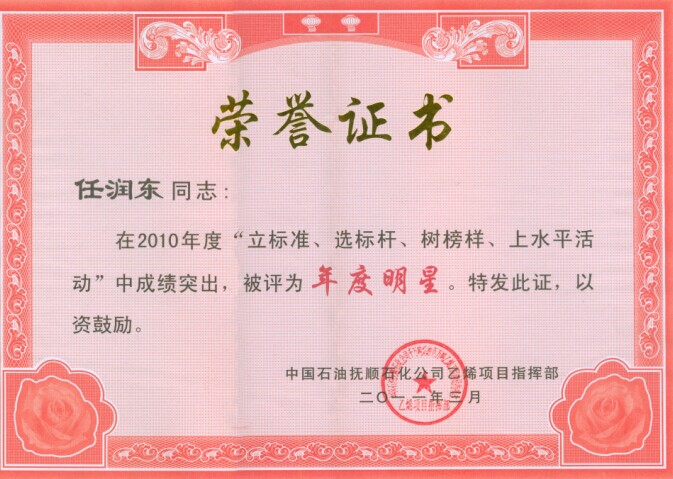 任润东同志被中国石油抚顺石化公司乙烯项目指挥部评为年度明星
